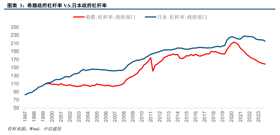 自始至终,希腊政府杠杆率都未超过日本。戏剧性的是,希腊政府杠杆率在150%水平时已爆发主权债务危机,然而日本至今政府杠杆率在200%以上,却未有风险迹象。