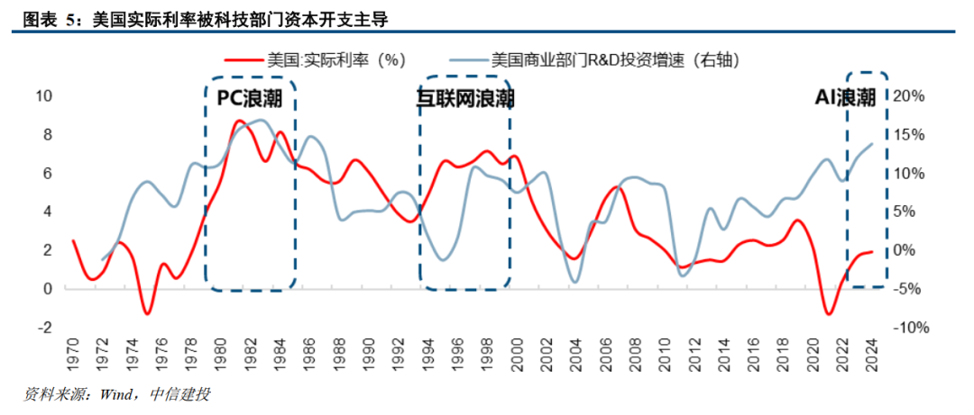 高增长、宽财政、紧货币可以并立,因为宽财政抬高利率,若没有宽货币配合,高利率将挤占私人部门需求。好在新一轮AI科技革命推升美国实际利率,这也意味着私人部门能够承担偏紧的货币和偏高的利率。这一阶段恰逢非美经济普遍承压,美国经济显得一枝独秀,大量国际资本涌入美国,助推美国资产涨价,美国私人部门需求扩容。